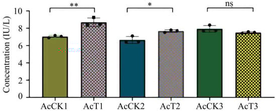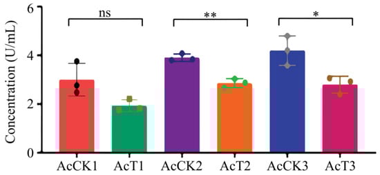 SOD activity in A. cerana 4-, 5-, and 6-day-old larval guts infected by A. apis. The experimental data are shown as mean ± SD and were subjected to Student’s t-tests, ns: p > 0.05, *: p < 0.05, **: p < 0.01. AcCK1, AcCK2, and AcCK3 respectively represent the uninfected 4-, 5-, and 6-day-old larval guts, whereas AcT1, AcT2, and AcT3 respectively represent the A. apis–infected 4-, 5-, and 6-day-old larval guts.