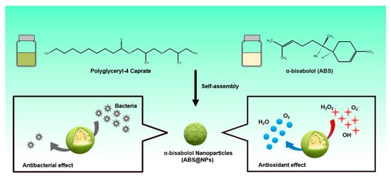 Schematic illustration of the preparation of α -bisabolol-loaded nanoparticles (ABS@NPs) and improved antioxidant and antibacterial effects.