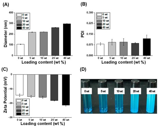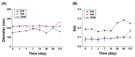 Particles of an oil phase in water are metastable, that is, they are thermodynamically unstable owing to their high energy level. Therefore, suspensions of oil particles dispersed in water using surfactants easily phase-separate through destabilization processes, such as precipitation, flocculation, and coalescence. Therefore, the long-term stability of ABS@NPs in DIW was analyzed at 25 °C by evaluating the changes in the NP size and PDI using DLS. The initial particle size (Figure 3A) and PDI (Figure 3B) of ABS@NPs indicated stability for a prolonged period, up to 112 days, without any notable change at ABS concentrations ranging from 0 to 10 wt%. In addition, all samples had a particle size of 300 nm or less and a PDI value of 0.3 or less. Thus, the results indicated that the fabricated ABS@NPs have remarkable long-term stability, and the system can be used as a successful platform for developing stable drug delivery systems.