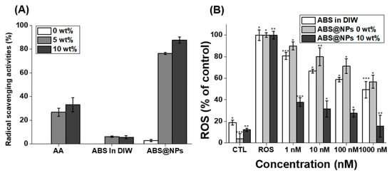 (A) Antioxidation activity of ABS@NPs with 0, 5, and 10 wt% ABS, compared to that of ascorbic acid (AA) in deionized water (DIW), assessed using the 2,2-diphenyl-1-picrylhydrazyl (DPPH) radical-scavenging assay. (B) Results of in vitro assays using the H2DCFDA assay kit. Antioxidation activity of ABS@NP 10 wt% at ABS concentrations ranging from 1 to 1000 nM; reactive oxygen species (ROS) and the control (CTL) groups represent the highest and lowest levels of ROS, respectively (* p < 0.05, ** p < 0.01, *** p < 0.005).