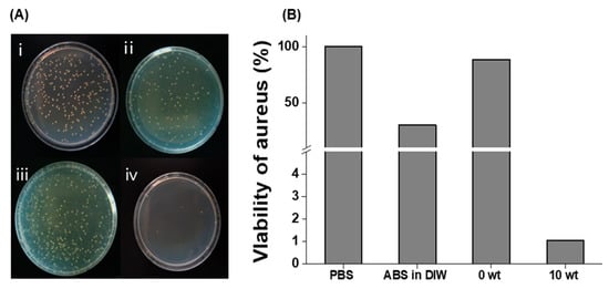 ABS has previously been reported to exhibit antibacterial activity [,]. However, owing to its hydrophobic properties, its antibacterial properties are not effectively manifested in the aqueous phase. In this study, we used a colony-counting method to analyze the antibacterial activity of ABS@NPs against S. aureus ATCC 6538. It was visually observed that the ABS@NPs significantly inhibited the growth of S. aureus compared to the control groups of PBS and ABS@NP 0 wt% (Figure 5A). The viability of S. aureus ATCC 6538 was reduced to 1 and 30% after treatment with ABS@NPs and ABS in DIW, respectively. Notably, these results show that the antibacterial effect of ABS increased considerably after encapsulation (Figure 5B), indicating that even a small amount of ABS exhibits considerably enhanced antibacterial activity.