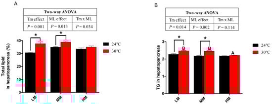 The total lipid (A) and triglyceride contents (B) in the hepatopancreas of juvenile E. sinensis fed the experimental diets at normal (24 °C)/high water temperature (30 °C). * means that there is a significant difference between different temperatures at the same dietary methionine level (p < 0.05). The A and B indicate significant differences among crabs fed diets with different dietary methionine levels at high water temperature (p < 0.05).