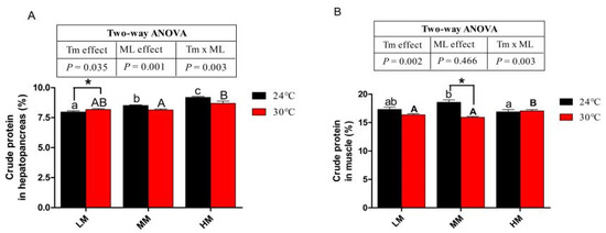 The crude protein content in hepatopancreas (A) and the crude protein in muscle (B) of juvenile E. sinensis fed the experimental diets at normal (24 °C)/high water temperature (30 °C). * means that there is a significant difference between different temperatures at the same dietary methionine level (p < 0.05). The a, b and c indicate significant differences among crabs fed diets with different dietary methionine levels at normal temperature (p < 0.05). The A and B indicate significant differences among crabs fed diets with different dietary methionine levels at high water temperature (p < 0.05).