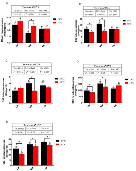 The antioxidative capacity of juvenile E. sinensis fed the experimental diets at normal (24 °C)/high water temperature (30 °C). (A) MDA: malondialdehyde; (B) SOD: superoxide dismutase; (C) CAT: catalase; (D) GSH-Px: glutathione peroxidase; (E) GSH content. * means that there is a significant difference between different temperatures at the same dietary methionine level (p < 0.05). The a, b and c indicate significant differences among crabs fed diets with different dietary methionine levels at normal temperature (p < 0.05). The A and B indicate significant differences among crabs fed diets with different dietary methionine levels at high water temperature (p < 0.05).