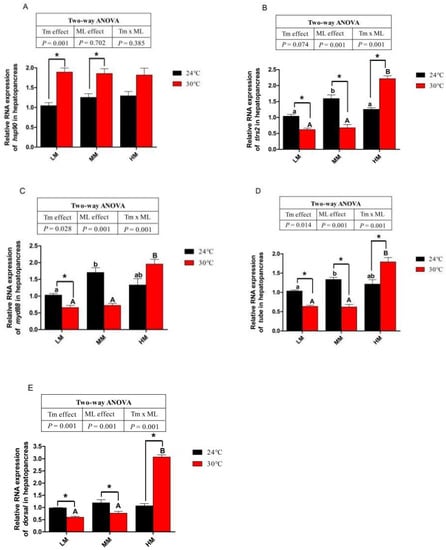 The toll-like receptor-related pathway of juvenile E. sinensis fed the experimental diets at normal water temperature (24 °C)/high water temperature (30 °C). (A) Hsp90: heat shock protein 90; (B) tlr2: toll-like receptor 2; (C) myd88: myeloid differentiation factor 88; (D) tube; (E) dorsal. * means that there is a significant difference between different temperatures at the same dietary methionine level (p < 0.05). The a and b indicate significant differences among crabs fed diets with different dietary methionine levels at normal temperature (p < 0.05). The A and B indicate significant differences among crabs fed diets with different dietary methionine levels at high water temperature (p < 0.05).