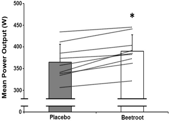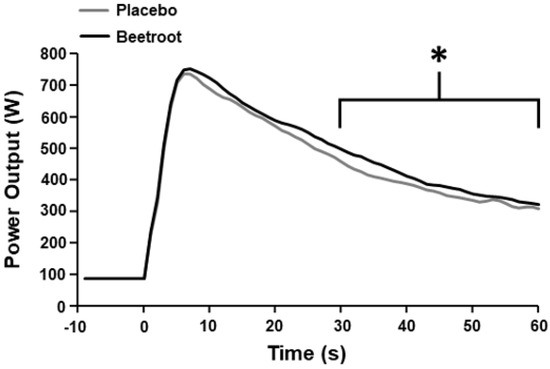 Mean power output during the 60 s end-sprint following 2 h moderate-intensity exercise after ingestion of nitrate-depleted beetroot (placebo) and nitrate-rich beetroot (beetroot) powder. * Higher than placebo (p < 0.001). Error bars are omitted for clarity.