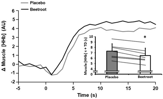 Muscle deoxyhaemoglobin + deoxymyooglobin concentration ([HHb]) response profiles during the initial stages of a 60 s end-sprint following 2 h moderate-intensity exercise after ingestion of nitrate-depleted beetroot (placebo) and nitrate-rich beetroot (beetroot) powder in a representative individual. Data are expressed as the change (Δ) from baseline. Inset illustrates muscle [HHb] time constant (τ) + time delay (TD) after ingestion of placebo (grey bar) and beetroot (open bar) powder. Dashed lines represent individual responses. Data presented as mean ± SD. * indicates significantly lower than placebo (p < 0.001).