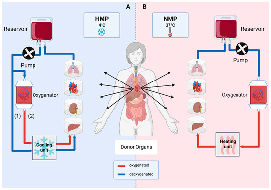 Ex vivo organ machine perfusion. Main vessels of an organ are cannulated and constantly perfused. (A) Hypothermic machine perfusion (HMP) is performed at 4 °C and can either take place without oxygenation (1) or with incorporation of an oxygenator (2), known as hypothermic oxygenated machine perfusion (HOPE). (B) Normothermic machine perfusion (NMP) is performed at 37 °C with oxygenated perfusion solutions under close-to-physiological conditions [3].
