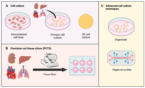In general, cell culture models are widely used to study different research questions. Most importantly, immortalized and primary cell lines are to be distinguished (Figure 3A). Immortalized cell lines are able to proliferate indefinitely, as they are mostly obtained from tumors. However, also methods for the immortalization of primary cells have been established [108]. Cell isolation involving enzymatic or mechanical disruption and further cultivation are frequently accompanied with the loss of some cell intrinsic features. In contrast, primary cells are directly isolated from tissue. However, they exhibit biological variability and can only be used for a limited duration due to a shorter life-span and cultivation-induced changes. In addition to typical 2D cell culture models, 3D techniques allow cells to grow into so-called spheroids. Cell–cell adhesion features are retained in those [106,108,111].