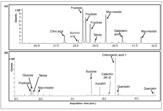 Pi infusions presented a rich metabolomic profile, comprised a total of 88 compounds, including 13 organic acids (accounting for 6.5% of the total peak area of the methanolic phase), 4 alcohols (0.48%), 11 amino acids (0.97%), 26 sugars and saccharides (40.4%), 3 fatty acids (1.45%), 3 terpenes (8.37%), 35 phenolic compounds (34.8%) and 5 other compounds (6.8%). The main compounds in Pi infusion and their relative contents in the methanolic and aqueous phases are presented in Table 1, and respective chromatograms are brought in Figure 1. In the methanolic phase, saccharides including sucrose (15.35% of total peak area), fructose (11.65%), myo-inositol (6.42%), and talose (4.52%) were most abundant, while chlorogenic acid and its derivatives (17.77%), quercetin and its derivatives (8.08%), and aucubin (2.79%) were most abundant non-saccharides. Saccharides were also the most abundant group of compounds in the aqueous phase, mainly fructose (25.91%), myo-inositol (25.90%), talose (10.31%), and glucose (9.04%), in addition to citric acid (3.81%), galactaric acid (3.57%) and malic acid (1.92%) as the prevalent non-saccharides. Our analysis revealed the presence of various chlorogenic acid isomers. Phenolic acids rarely appear in a free form, and typically are esterified with quinic or tartaric acid or a sugar moiety at different locations, giving rise to various structural isomers [22]. Specifically, chlorogenic acid is a group of caffeic and quinic acid esters, comprising six different isomers (3-O- caffeoylquinic acid (3CQA), 4CQA, 5CQA, 3,4-dicaffeoylquinic acid (3,4-DQA), 3,5-DQA and 4,5-DQA), or 26 compounds when considering cis-trans isomerization [23]. These have also been reported to vary in occurrence, bioavailability, and bioactivity [24]. Similarly, flavonoids, e.g., quercetin, present characteristic versatility due to structural variability, owing to conjugation with various sugar moieties at various positions [25,26]. As GC/MS metabolomic analysis cannot be used for reliable quantification, the current data only provided relative quantification of these compounds, and further use of quantitative methods, e.g., LC-QqQ-MS, accompanied by commercially available standards, would be required for supplying quantitative information about the levels of the reported metabolites in Pi infusion.