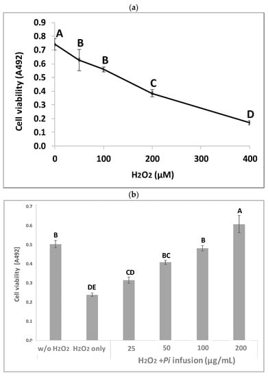 Pi infusion reduces H2O2-induced increases in intracellular reactive oxygen species (ROS) levels in neuronal cells. Cells were labeled with (2’7’-dichlorofluorescein diacetate) DCF-DA and washed, before being treated with increasing concentrations of Pi infusion for 2 h. Then, hydrogen peroxide (200 µM) was added to the medium and fluorescence levels were measured 1 h and 18 h thereafter. The results are presented as mean ± SEM and represent two independent experiments (n = 12). The results were analyzed by one-way ANOVA followed by the Tukey–Kramer multiple comparison test. Columns marked with different letters (A, B, C, etc.) represent statistically significant differences (p < 0.05).