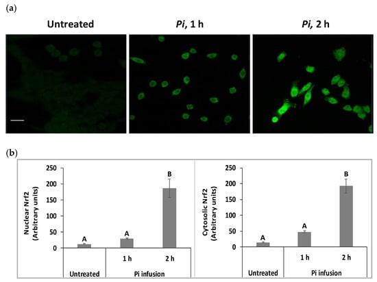 Pi infusion enhances nuclear factor erythroid 2–related factor 2 (Nrf2) expression levels and promotes Nrf2 translocation to the nucleus of neuronal cells. SH-SY5Y cells were treated by Pi infusion (200 µg/mL) for 1 h or 2 h and then immunostained for Nrf2 and nuclei were stained with DAPI. (a) Representative images of each treatment from two independent experiments. Each experiment was conducted in duplicates. Bar: 20 μm. (b) The Image J-measured fluorescence intensities of DAPI were used to normalize nuclear and cytoplasmic Nrf2 fluorescence intensity in 11 different photographed fields. Nrf2 intensity was normalized to DAPI intensity. The results are presented as mean ± SEM (n = 11) and were analyzed by one-way ANOVA followed by the Tukey–Kramer multiple comparison test. Columns marked with different letters (A, B) represent statistically significant differences (p < 0.05).