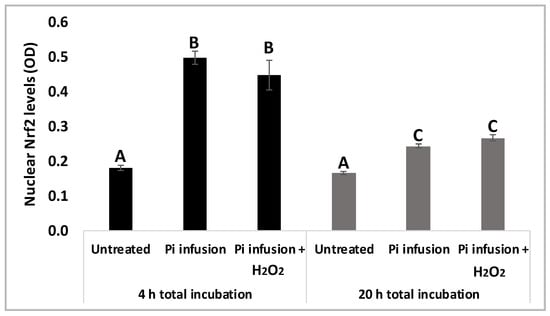 Pi infusion enhances Nrf2 expression levels in the nucleus of neuronal cells. SH-SY5Y cells were pretreated with Pi infusion (200 µg/mL) for 2 h or 18 h, and then incubated for an additional 2 h with H2O2 (200 µM). Nrf2 levels in the nucleus were then determined. The results are from a representative experiment out of two independent experiments, with each experiment conducted in duplicates. The results are presented as mean ± SEM (n = 4) and were analyzed by one-way ANOVA followed by the Tukey–Kramer multiple comparison test. Columns marked with different letters (A, B, C) represent statistically significant differences (p < 0.05).