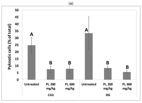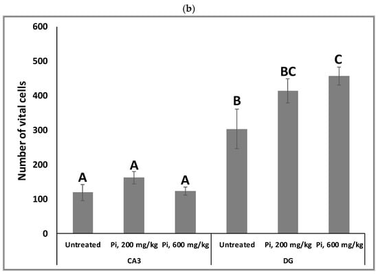 Alterations in the intracellular redox ratio during aging appear to be highly localized to the brain hippocampus [36,37]. We, therefore, examined whether Pi infusion has a neuroprotective effect in vivo by preventing neuronal mortality in the hippocampus of aging mice. Figure 8a demonstrates that after 18 months of daily treatment with Pi infusion-supplemented drinking water, mouse brains contained a significantly reduced percentage of pycnotic cells in the CA3 and DG (70% and 83% reduction, respectively). In the DG area, 600 mg/kg Pi infusion also significantly enhanced the number of vital neuronal cells by more than 50% (Figure 8b).