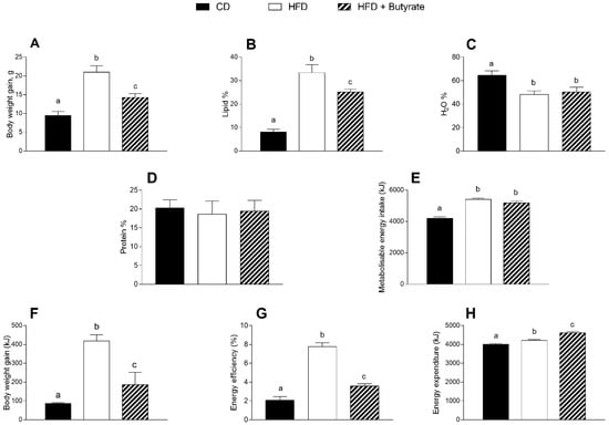 Effects of butyrate treatment on body composition and energy balance in diet-induced obese mice: (A) body weight; (B) lipid percentage; (C) water percentage; (D) protein percentage; (E) metabolizable energy intake; (F) body weight gain; (G) energy efficiency (%) and (H) energy expenditure are reported. Data are shown as means ± SEM from n = 6 animals/group. Different letters (a,b,c) on top of the bars indicate statistically significant differences (p < 0.05) among groups.