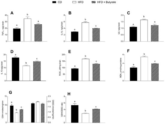 Effects of butyrate treatment on inflammation and oxidative stress in the brain cortex of diet-induced obese mice: (A) TNF-α; (B) IL-1β; (C) IL-6; (D) IL-10; (E) ROS; (F) MDA; (G) glutathione (GSH) and oxidized glutathione (GSSG) and (H) GSH/GSSG ratio are reported. Data are shown as means ± SEM from n = 6 animals/group. Different letters (a,b,c) on top of the bars indicate statistically significant differences (p < 0.05) among groups.