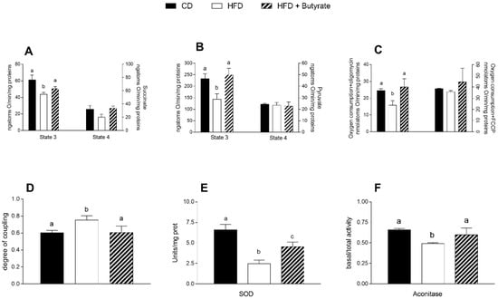 Effects of butyrate treatment on respiratory parameters of isolated mitochondria in the cerebral cortex in diet-induced obese mice: (A) Mitochondrial respiration rates measured in the presence of succinate and rotenone or (B) pyruvate and malate as substrates; (C) oxygen consumption in the presence of oligomycin or uncoupled by carbonyl cyanide 4-(trifluoromethoxy) phenylhydrazone (FCCP); (D) degree of coupling; (E) superoxide dismutase activities (SOD) and (F) aconitase activities are reported. Data are shown as means ± SEM from n = 6 animals/group. Different letters (a,b,c) on top of the bars indicate statistically significant differences (p < 0.05) among groups.