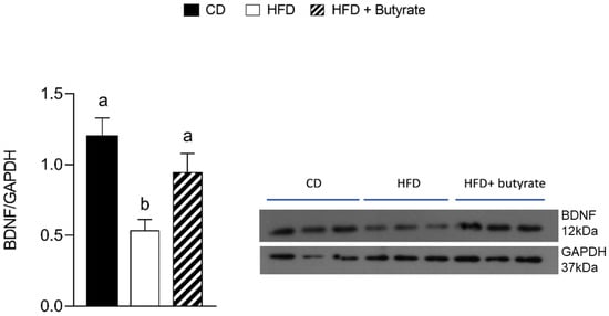 Effects of butyrate treatment on BDNF expression levels in the cerebral cortex of diet-induced obese mice. Expression level of BDNF was normalized with that of GADPH. Data are presented as means ± SEM from n = 3 animals/group. Different letters (a,b) on top of the bars indicate statistically significant differences (p < 0.05) among groups.
