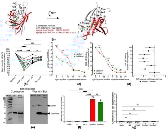 In the next step, we investigated whether the allergenicity of Bet v1 was affected by binding to iron—quercetin complexes. Bet v1 has two described IgE epitopes to which birch pollen allergic IgE antibodies bind to spanning, from aa29 to aa58 (epitope 1) and from aa73 to aa103 (epitope 2) [44]. In silico analysis revealed that both IgE epitopes were affected by FeQ2: epitope 1 at Phe 30 and Phe 58 and epitope 2 at Tyr 81, Tyr83 and Ile 102. (Figure 2a) similar as described for FeQ2 binding masking major lipocalin allergens [40,41]. Next, we verified the biological relevance of the in silico findings, by testing whether individual IgE of birch pollen allergic patients (n = 12) bound similarly to plate-bound apoBet v1 (without any ligands) or with the ligands FeQ2 (Betv1_FeQ2), quercetin alone (Betv1_Q2) or using ferroxamin complexes as a hydroxame-based siderophore-iron complex to which Bet v1 should not bind to (Betv1_FO) as control. Indeed, a significant reduction in IgE-binding was very apparent against holoBet v 1 with FeQ2 and to a lesser degree also to quercetin alone (Figure 2b). Additionally, in blocking experiments with pooled sera preincubated with various doses of apoBet v 1, the binding to plate-bound holoBet v 1 was significantly reduced compared to apoBet v 1 (Figure 2c). In blocking experiments when individual sera (n = 6) were preincubated with various concentrations of apo- or holo-Bet v 1 a significantly greater blocking (Supplementary Figure S1). Thus reduced IgE-binding was achieved with the apo-form—as depicted in the summary graph and confidence interval plot in Figure 2d—and highlights that IgE epitopes were masked and not accessible with the holo-form (Figure 2d). A similar pattern was evident in Western Blot, with a reduced IgE-binding (using pooled sera) seen when Bet v 1 was in conjunction with FeQ2 (Figure 2e). Moreover, when human-generated mast cells were sensitized with sera of birch pollen allergic sera, crosslinking with holoBet v1 compared to apoBet v 1 was less efficient and resulted in significantly less degranulation. No degranulation was achieved when mast cells were sensitized with non-allergic sera, (Figure 2f,g).