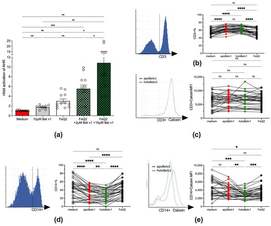 Next, we aimed to prove that the ligands were responsible for the reduced allergenic features of Bet v 1 and that in fact the uptake of these ligands into human immune cells was facilitated by Bet v 1. To prove that Bet v 1 facilitated quercetin-transport into human cells, the human AZ-AhR cell line stably transfected with several aryl hydrocarbon-receptor AhR binding sites upstream of the luciferase reporter gene [45] were stimulated with apo-/holo-Bet v 1, as quercetin is a known activator of AhR. Indeed, the activity of AhR concentration-dependently increased by the addition of Bet v 1 from 3.0 1.4 with FeQ2 alone to 5.6 2.6 with 2 µM and to 10.84 7.1 with 10 µM Bet v 1 (Figure 3a). To proof that not only quercetin, but also iron was transported into human immune cells, PBMCs from allergic donors (n = 34) were stimulated with apo/holoBet v 1. Indeed, though Bet v 1 led to an increase in cell survival (Supplementary Figure S2) in the lymphocytic compartment and led to the relative expression of CD3+, this was irrespective of the ligand and also the labile iron pool, measured by the quenching of the Calcein-signal—was not affected (Figure 3b,c). In contrast, relative CD14 expression decreased upon Bet v 1 exposure but further significantly decreased in PBMCs incubated with holoBet v 1 compared to cells stimulated with apoBet v 1 only. Moreover, holoBet v 1 incubation led to a significant increase of the labile iron in monocytes with PBMCs being unaffected by apoBet v 1 and also by incubation of FeQ2 alone (Figure 3d,e). Importantly, the relative numbers of living cells did not differ between apo- and holoBet v 1 incubated cells (Supplementary Figure S2). To sum up, here we show that Bet v 1 was able to shuttle quercetin as well as iron into human cells, thereby on the one hand activating the anti-inflammatory AhR pathway and on the other hand increasing the labile iron of CD14+ cells, but not of CD3+ cells.