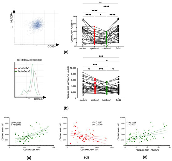 We further assessed the impact of iron-shuttling by Bet v 1 on antigen presentation by assessing labile iron and the expression of HLADR as well as the costimulatory molecule CD86+ in CD14+ cells. Along with the increase of labile iron also the maturation state of the CD14+ cells changed with a significantly less mature state of CD14+HLADR+CD86+ cells observed in holoBet v 1-stimulated PBMCs (Figure 4a,b). Particularly CD14+ with HLADRlow/− are attributed to an immunosuppressive phenotype [46]. An increase of the labile iron was especially associated with a decrease in HLADR expression, which was not seen with CD86 (Figure 4c,d). As such, relative numbers of mature monocytes with antigen presenting skills were associated in regression analyses with a decrease of labile iron (Figure 4e).