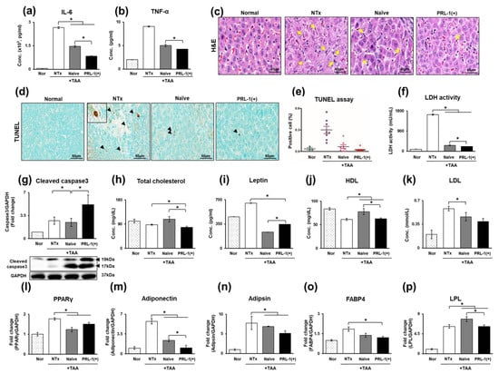Effect of naïve and PRL-1(+) cells on apoptosis in TAA-injured rat livers. The expression of inflammation and apoptosis markers in TAA-injured rat livers (a) IL-6, (b) TNF-α, (c) H&E; yellow arrows: apoptotic cells, (d,e) TUNEL assay, (f) LDH activity, (g) cleaved caspase 3. The expression of lipid metabolism markers in the TAA-injured rat model in the serum and via mRNA analysis (h) total cholesterol, (i) leptin, (j) HDL, (k) LDL, (l) PPARγ, (m) adiponectin, (n) adipsin, (o) FABP4, and (p) LPL. All experiments were repeated in duplicate to triplicate. * p < 0.05.