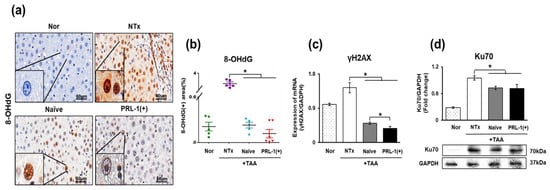 DNA damage induced by various hazardous substances can lead to liver damage. DNA damage has been reported to cause inflammation and worsen liver damage [26]. As shown in Figure 2a, the DNA damage marker 8-oxo-2′-deoxyguanosine (8-OHdG) was detected in DNA-damaged TAA-injured rat livers. 8-OHdG positivity was significantly increased in the NTx group compared with the naïve and PRL-1(+) groups (* p < 0.05, Figure 2b). Additionally, DNA damage marker levels (γH2AX and Ku70) were significantly decreased in the naïve and PRL-1(+) groups relative to those in the NTx group (* p < 0.05, Figure 2c,d). In particular, γH2AX levels were significantly decreased in the PRL-1(+) group compared to the naïve group. These results confirm that transplanted naïve and PRL-1(+) cells in TAA-injured rat livers facilitate DNA repair.