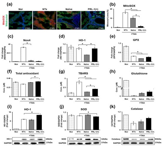 TAA causes cirrhosis of the liver by inducing oxidative stress. Sustained oxidative stress accelerates liver cirrhosis [20]. As shown in Figure 3a,b, the mitochondrial ROS levels in TAA-injured rat livers were significantly increased in the NTx group relative to those in the naïve and PRL-1(+) groups (* p < 0.05, Figure 3a,b). Additionally, the expression of NAPDH oxidase 4 (Nox4) was significantly decreased in the naïve and PRL-1(+) groups. (* p < 0.05, Figure 3c). The levels of the downstream factors of Nox4, such as heme oxygenase-1 (HO-1) and glutathione peroxidase (GPX), were significantly decreased in the naïve and PRL-1(+) groups and significantly increased compared with the PRL-1(+) group (* p < 0.05, Figure 3d,e). When antioxidants were confirmed through ELISA at the serum level, total antioxidant levels were decreased in the NTx group relative to those in the naïve and PRL-1(+) groups.