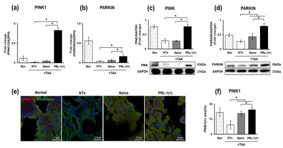 Mitophagy, known as macroautophagy, selects damaged mitochondria for degradation. The cell double-membrane autophagosome selectively targets the damaged region of the entire mitochondria, causing autophagosomes to fuse with ribosomes for the degradation of the damaged mitochondria [28]. Mitophagy markers, including PTEN-induced kinase 1 (PINK1) and E3 ubiquitin ligase (PARKIN), were analyzed to analyze mitophagy in naïve and PRL-1(+) cell-transplanted TAA-injured rat livers. The mRNA and protein levels of the markers were significantly increased in the naïve and PRL-1(+) groups compared to those in the NTx group. (* p < 0.05, Figure 5a–d). PINK1 expression was confirmed to be localized in the mitochondria in the tissue cytoplasm, and the results were consistent between the mRNA and protein levels (* p < 0.05, Figure 5e,f). Taken together, these results confirmed that mitophagy is activated through PINK1-PARKIN signaling via naïve and PRL-1(+) transplantation in TAA-treated rat livers.