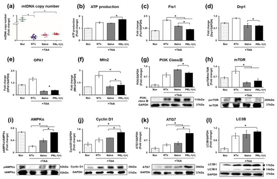 On the other hand, AMP-activated protein kinase-alpha (AMPKα) was significantly increased in the naïve and PRL-1(+) groups relative to that of the NTx group, and there was a significant difference between the naïve and PRL-1(+) groups (* p < 0.05, Figure 6i). Additionally, cyclin D1, autophagy-related 7 (ATG 7), and microtubule-associated protein 1A/1B light chain 3B (LC3B) levels were analyzed. The expression levels were significantly increased in the naïve and PRL-1(+) groups relative to those of the NTx group (* p < 0.05, Figure 6j–l). Therefore, it was confirmed that when naïve and PRL-1(+) cells were transplanted into the TAA-injured rat model, mitochondrial biogenesis and autophagy were positively regulated.