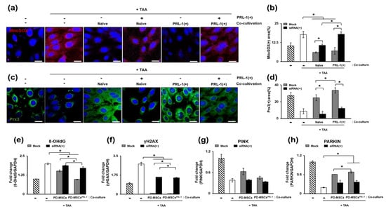 In addition, when peroxiredoxin 3 was evaluated, it was found to be increased in the naïve and PRL-1(+) cocultivated groups compared with the TAA-treated group and decreased in the PRL-1(+) cocultured group compared to the naïve cocultured group. On the other hand, in each naïve cocultured group, it was significantly decreased in the PRL-1 knockdown group, but it was increased in the PRL-1(+) cocultivated group (* p < 0.05, Figure 7c,d). Next, the DNA repair markers8-OHdG and γH2AX were analyzed. Additionally, 8-OHdG and γH2AX were downregulated in the naïve and PRL-1(+) cocultured groups relative to the levels of each in the TAA-treated group (* p < 0.05, Figure 7e,f). The expression of PINK and PARKIN was significantly increased in the naïve and PRL-1(+) cocultivated groups relative to that of the TAA-treated group. It was confirmed that the PRL-1 knockdown groups had significantly decreased expression (* p < 0.05, Figure 7g,f). Therefore, it was confirmed that the coculture of naïve and PRL-1(+) cells with WB-F344s induces antioxidant effects.