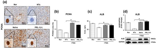 Additionally, when the levels of albumin (ALB), a hepatic regeneration marker, were measured in the serum and at the protein level, they were found to be significantly increased in the naïve and PRL-1(+) groups compared to the NTx group (* p < 0.05, Figure 8c,d). These results demonstrate that the transplantation of naïve and PRL-1(+) cells in a TAA-induced rat model enhances cellular proliferative capacity.