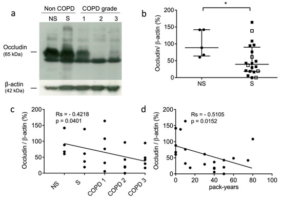 Expression level of occludin in lung tissue samples. (a): Western blot analysis (lung tissue lysates, 100 µg of total proteins/sample). Representative samples correspond to non-COPD never-smokers (NS), non-COPD smokers (S), and COPD patients (all being smokers with different stages of COPD severity): GOLD (Global initiative for chronic Obstructive Lung Disease) 1 (mild stage), GOLD 2 (moderate stage), and GOLD 3 (severe stage). (b): Densitometric analysis of occludin expression level (normalized data using β-actin as control; ImageJ software). Bars represent median ± quartile. Statistical significance was assessed using Mann–Whitney test (* p < 0.05). (c): Correlation between occludin level and patient status (NS, S, and COPD grades; GOLD 1–GOLD 3). (d): Correlation between occludin level and pack years (i.e., smoking history). Correlations were determined by linear regression and indicated by Spearman coefficient (Rs) and levels of significance (p).