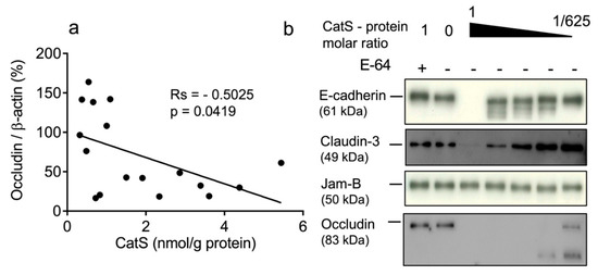 CatS activity negatively correlated with immunoreactive occludin level. (a): Correlation between CatS activity and occludin level in lung tissue lysates. Correlation was determined by linear regression and indicated by Spearman coefficient (Rs) and levels of significance (p). (b): in vitro hydrolysis of human recombinant E-cadherin, claudin-3, JAM-B, and occludin by CatS. Constant amount of junction proteins was incubated with CatS (molar ratio: 1:625 to 1:1) and incubated for 1 h at 37 °C in cell culture medium before their hydrolysis products were revealed by immunoblotting.