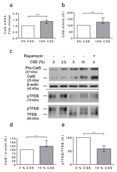 At day 6 after the PMA-dependent differentiation of human THP-1 monocytes [48,53], the macrophages were exposed to 10% CSE for 12 h. First, any dose-dependent decrease in the cell viability was observed (MTT assay); consequently, it was suggested that CSE did not exhibit lethal cellular effects under the present experimental conditions (Figure S3). Following the exposure of THP-1 cells to CSE, a significant increase in CatS mRNA level was observed (Figure 3a), which corroborated with enhanced peptidase CatS activity in the conditioned medium (p = 0.0079), thereby establishing that CSE elicited an increase in CatS secretion (Figure 3b). In addition, the Western blot analysis of the cell lysates showed a CSE-dependent upregulation of CatS protein level (both its ~25 kDa mature form and its ~37 kDa proform) (Figure 3c), which was confirmed by densitometry analysis (Figure 3d). According to previous reports, it was proposed that CSE could drive CatS secretion via the activation of P2X7 receptors [36,59]. On the other hand, it was recently established that nicotine, a major component of cigarette smoke, may upregulate CatS expression in vascular smooth muscle cells and in atherosclerotic plaques [52] via the inhibition of mTORC1 (mammalian target of rapamycin complex 1), which is associated with a decreased phosphorylation of TFEB (transcription factor EB), which, in turn, is primarily known as a central regulator of autophagy/lysosomal biogenesis [60]. THP-1 cells were treated with 10% CSE in the presence or absence of AZ 11645373, a P2X7 receptor antagonist. Immunoblot analysis showed that AZ 11645373 did not reduce the expression level of both CatS and pro-CatS, implying that the CSE-induced upregulation of macrophage CatS is not mediated by the MAPK signaling pathway through P2X7 receptor activation (data not shown). Alternatively, THP-1 cells were treated with CSE or with rapamycin (50 nM), an mTORC1 inhibitor of clinical relevance. Both CSE and rapamycin induced an increase in immunoreactive, mature CatS and its proform (Figure 3c). Conversely, a dose-dependent decrease in immunoreactive phosphorylated TFEB (pTFEB, ~70 kDa), corresponding to an impaired phosphorylation of TFEB (~65 kDa), was observed for the treated cells (Figure 3e), which is consistent with a previous report that indicated that the phosphorylation of TFEB at Ser211 by mTORC1 inhibits TFEB activity, while the pharmacological inhibition of mTORC1 activates TFEB by promoting its dephosphorylation [61]. Thus, the data show that the CSE-induced upregulation of macrophage CatS occurs through the mTORC1 signaling pathway.
