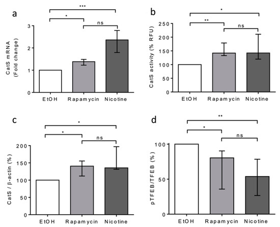 Next, we compared the effects of rapamycin and nicotine on THP-1 cells. Both rapamycin and nicotine led to a significant increase in CatS mRNA expression, peptidase activity of secreted CatS, and its intracellular protein level (Figure 4a–c), which was associated with a decrease in TFEB phosphorylation (see pTFEB/TFEB ratio: Figure 4d). Taken together, our data indicate that CSE increased CatS expression through the mTOR/TFEB signaling pathway in THP-1 cells and suggest that the CSE-induced upregulation of CatS was partly elicited by nicotine, one of its main constituents, as observed for vascular smooth muscle cells [52].