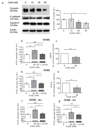 Increased permeability of lung epithelial cells is associated with the CatS-dependent proteolytic damage of occludin. (a): 16HBE cells were treated with CatS for 12 h and then lysed. Lysates were submitted to electrophoresis before protein levels of occludin, E-cadherin, and claudin-3 were analyzed by Western blot (β-actin, load control). A representative sample of three independent Western blot experiments is shown. Densitometric analysis of immunoreactive occludin is also shown. (b): 16HBE cells were grown on Transwell inserts (submerged culture) and treated with CatS during 12 h. FITC-dextran was added on the upper chamber and fluorescence was measured on the basal chamber. Experiments were performed in presence or absence of LHVS (1 µM). (c): Transepithelial electrical resistance (TEER) of 16HBE cells. All the experiments were performed as three independent experiments, in which each were performed in triplicate. Data were normalized to the control experiment. (d): NHBE cells were treated by CatS and FITC-dextran permeability assay performed as described above. (e): NHBE cells were treated by CatS and TEER was measured. (f): FITC-dextran permeability assays were conducted on 16HBE cells that were grown at the air–liquid interface (ALI) and then treated with CatS as described above. (g): Identical FITC-dextran permeability assays were conducted on NHBE cells, which were grown at the air–liquid interface (ALI). Data corresponds to the average of five independent experiments. Bars represent median ± quartile. Statistical significance was assessed using non-parametric Kruskal–Wallis (a,b,d,f,g) or Mann–Whitney U (c,e) tests (* p < 0.05; ** p < 0.01). ns: not significant.