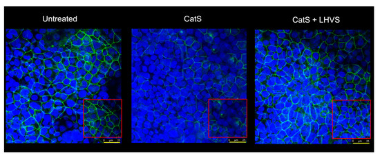 A similar increase in permeability, linked to a drop in transepithelial electrical resistance, was observed following the incubation of normal human bronchial/tracheal epithelial cells (NHBE cells) with CatS (Figure 5d–e). Beside standard (i.e., submerged) cultures, the air–liquid interface (ALI) approach, in which the apical surface of the epithelial cells is exposed to air, is primarily used to mimic in vivo respiratory tract epithelia, since human bronchial/tracheal epithelial cells undergo muco-ciliary differentiation and possess a pseudostratified morphology. Accordingly, ALI cell cultures may provide more robust and physiologically relevant models for validating assays on barrier function and/or epithelial permeability [63]. As reported for the 16HBE and NHBE cells cultured under standard conditions, CatS induced an increase in the permeability of the 16HBE and NHBE cells cultured at an air–liquid interface, which was significantly impaired by the addition of LHVS (Figure 5f–g). Next, considering this variation of epithelial permeability, we analyzed the impact of CatS activity on the tight junctions to further explore the molecular mechanism by which CatS could injure the lung epithelium. Confocal microscopy studies indicated that the immunolabelling and distribution of occludin within tight junctions were drastically altered by CatS (Figure 6).