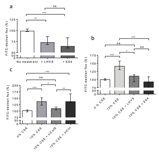 CatS secreted by THP-1 macrophages induced an increase in permeability of lung epithelial cells. (a): THP-1 cells (lower culture chamber) were co-cultured with 16HBE cells (seeded on Transwell inserts, upper culture chamber). FITC-dextran permeability assays were performed as described above. LHVS (100 nM) or E64 (1 µM) were used as control. (b): Otherwise, THP-1 cells (lower culture chamber), which were co-cultured with 16HBE cells (seeded on Transwell inserts, upper culture chamber), were exposed to CSE. LHVS or E-64 were used as control. FITC-dextran permeability assays were further performed. (c): FITC-dextran permeability assays. Transient knockdown of CatS was achieved by transfection of THP-1 cells by specific siRNAs. Normalized data corresponded to the average of three independent experiments. Bars represent median ± quartile. Statistical significance was assessed using Kruskal–Wallis test (* p < 0.05; ** p < 0.01; *** p < 0.001). ns: not significant.