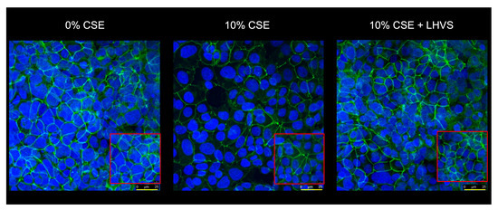 We repeated the experiments on the 16HBE (Figure 8a) and NHBE (Figure 8b) cells cultured at an air–liquid interface to confirm/consolidate the previous data. Again, a significant increase in FITC-Dextran flux (16HBE-ALI, p < 0.001; NHBE-ALI, p < 0.01) was observed following the exposure of the macrophages to CSE, while the addition of both pharmacological inhibitors E-64 and LHVS restored the epithelial barrier function found for the untreated THP-1 cells (Figure 8). Accordingly, the data demonstrate that cigarette smoke triggered the overexpression and secretion of enzymatically active CatS by macrophages, which, in turn, contributed to the impairment of the permeability regulation of lung epithelial cells. Moreover, the drop in the fluorescence signal when using an anti-occludin antibody confirmed that the CSE-driven decrease in epithelial integrity was associated with a loss of immunoreactive occludin (Figure 9). In agreement with confocal microscopy analysis, a similar decrease in immunoreactive occludin was observed by immunoblotting (See Figure S5).
