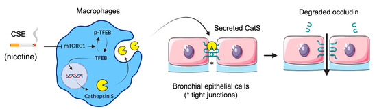 Proposed mechanism of cigarette smoke-induced increase in lung epithelial cell permeability (synthetic graphic). Cigarette smoke triggers upregulation of CatS by macrophages through the mTOR/TFEB signaling pathway. CatS overexpression was driven by nicotine, a major chemical of cigarette smoke. Consequently, secreted active CatS could proteolytically damage occludin, leading to impaired integrity of the epithelial barrier. Figure prepared with BioRender (https://biorender.com/, accessed on 2 April 2021).