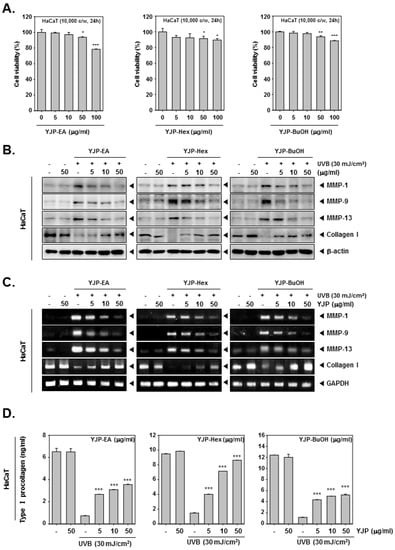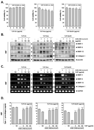 The expression of MMPs (MMP-1, -9, -13), contributing to collagen degradation, were increased in UVB-irradiated HaCaT and HDF cells, while Collagen I was decreased [3,6,18]. However, YJP-EA, -Hex, and -BuOH inhibited MMP-1, -9, and -13 but restored Collagen I in the protein and mRNA levels. In addition, when the Pro-Collagen content was investigated, it was confirmed that the percentage of Type I Pro-Collagen, which had been reduced by UVB-irradiation, was restored by treatment with YJP-EA, -Hex, and -BuOH. These results demonstrate that YJP fractions have significant anti-wrinkle effects through regulating MMPs at low toxicity in both HaCaT and HDF cells.