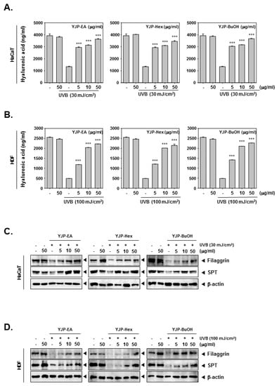 To investigate the moisturizing effects of YJP-EA, Hex, and BuOH, we stimulated HaCaT and HDF cells with UVB irradiation. After UVB irradiation, YJP-EA, Hex, and BuOH (0, 5, 10, 50 μg/mL) were treated for 24 h. The contents of the hyaluronic acid were measured using a Hyaluronan ELISA kit. As shown in Figure 3A,B, the contents of the hyaluronic acid were decreased with UVB irradiation in both HaCaT and HDF cells. However, the treatment of the YJP fraction restored the decreased hyaluronic acid with increasing concentration. Next, we investigated the protein expression of filaggrin and SPT by Western blot analysis to study the molecular mechanism of the moisturizing effect (Figure 3C,D). In both HaCaT and HDF cells, UVB irradiation inhibited the filaggrin and SPT expression. Despite the UVB irradiation, filaggrin and SPT were restored by YJP-EA, Hex, and BuOH. The results show that YJP fractions can recover moisturizing effects in UVB-irradiated HaCaT and HDF cells.