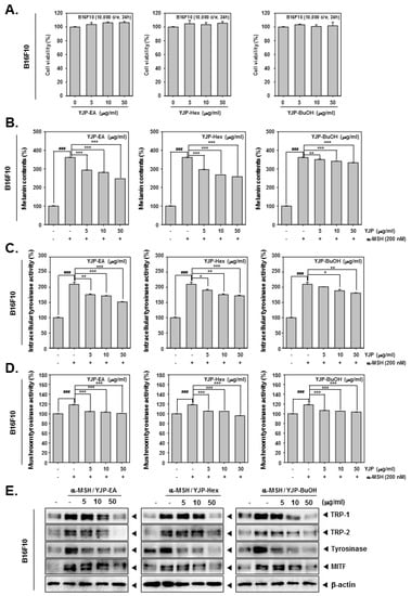 We first confirmed the cytotoxicity of YJP-EA, Hex, and BuOH on B16F10 cells using the MTT assay (Figure 4A). We confirmed that all YJP fractions had no cytotoxicity on B16F10 cells. Next, we measured the melanin contents from B16F10 cells treated with α-MSH (200 nM) and YJP-EA, Hex, and BuOH (0, 5, 10, 50 μg/mL) for 48 h. The cell lysates were measured using VARIOSKAN LUX (Thermo Fisher Scientific Inc., Waltham, MA, USA) at 490 nm. The melanin contents were increased by α-MSH, which is known to stimulate melanin synthesis, and then inhibited by YJP fractions. Next, the intracellular tyrosinase activity and mushroom tyrosinase activity were analyzed under the same conditions as that of the B16F10 cells (Figure 4C,D). α-MSH also induced both intracellular tyrosinase activity and mushroom tyrosinase activity. However, the YJP fractions significantly inhibited both activities in the B16F10 cells. From the whole cell lysate, we confirmed the protein-expression levels of TRP-1, -2, and tyrosinase and the microphthalmia-associated transcription factor (MITF), known as the enzymes and factors that promote melanin formation (Figure 4E). TRP-1, -2, tyrosinase, and MITF were induced by α-MSH; however, all YJP fractions reduced it. The results show that YJP-EA, Hex, and BuOH inhibit melanin contents and the related enzyme in mouse skin melanoma B16F10 cells.