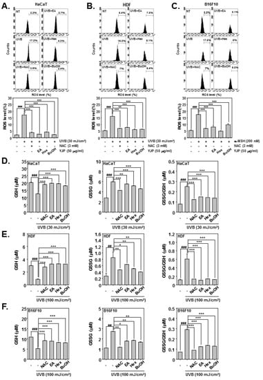 Antioxidant effects of YJP-EA, -Hex, and -BuOH on HaCaT, HDF, and B16F10 cells. HaCaT and HDF cells were irradiated with UVB; B16F10 cells were stimulated by α-MSH. We then treated them with NAC (3 mM) for 15 min or with YJP-EA, -Hex, and -BuOH (50 μg/mL) for 12 h. (A–C) The ROS production was analyzed by flow cytometer. (D–F) The GSH and GSSG levels were measured, and the GSSG/GSH ratio was evaluated in both cells. All experiments were performed individually in triplicate. ### p < 0.001 vs. non-treated (NT) cells, ## p < 0.01 vs. non-treated (NT) cells, *** p < 0.001 vs. UVB or α-MSH-stimulated cells, ** p < 0.01 vs. UVB or α-MSH-stimulated cells, and * p < 0.05 vs. UVB or α-MSH-stimulated cells.