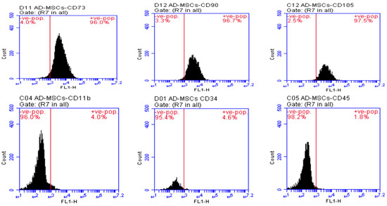 Finally, before performing the animal study, International Society Cell Therapy’s (ISCT) minimal criteria were followed to confirm the stemness of the cultured cells through flow cytometric analysis of some negative and positive surface markers to ensure the retaining of their phenotype. First, specific rats’ antibodies (CD11b, CD34, CD45, CD73, CD90, and CD105), bought from Sigma Aldrich, were added to the isolated AD-MSCs. Then, the expression level of these molecules on the cell surface was detected using a FACS Caliber flow cytometer (Becton Dickinson, Franklin Lakes, NJ, USA), and FACSDiva Software was used to analyze the results [25].