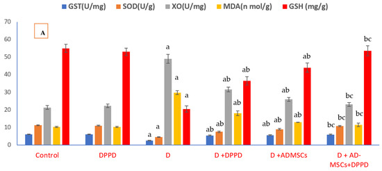 Furthermore, Figure 3A,B and Table S1 (Supplementary Information) showed that the diabetic group exhibited significant serum glucose and HbA1c levels increase while necessary insulin and C-peptide declined, compared to the control group. However, all three diabetic treated groups revealed a noticeable enhancement in all measured parameters relative to diabetics. Interestingly, the percentage of change showed that diabetic rats treated with the AD-MSCs+DPPD combination detected the most marked hypoglycemic superiority compared to other treated groups.