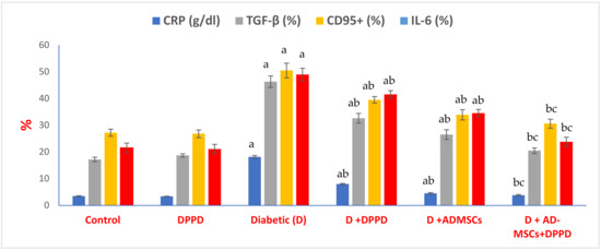Figure 5 and Figure S1a–c and Table S3 (Supplementary Information) illustrate marked rises in pancreatic inflammatory markers (CRP, TGF-β, CD95+, and IL-6) %, compared to control. However, these inflammatory markers % exhibited significant declines in all diabetic rats treated groups compared to the diabetic untreated group. Of note, the AD-MSCs+DPPD combination revealed the highest anti-inflammatory efficacy than DPPD or AD-MSCs treatment alone in diabetic rats.