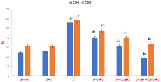 Pancreatic T-Helper (CD 4) and T-Cytotoxic (CD 8) %. Values expressed as ±SEM (n = 6). a, b & c are Significant differences (p ≤ 0.05) compared to control, diabetic untreated and DPPD-diabetic treated groups, respectively. % is the percent of change compared to the diabetic group.