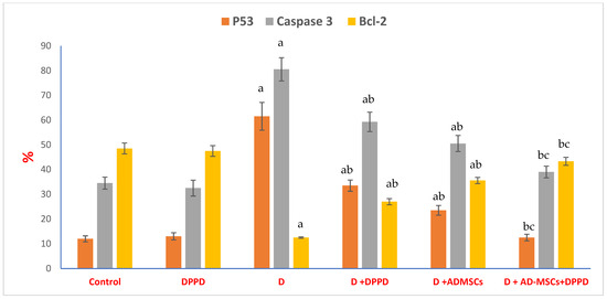 Pancreatic P53, caspase 3, & Bcl-2%. Values expressed as ±SEM (n = 6). a, b & c are Significant differences (p ≤ 0.05) compared to control, diabetic untreated and DPPD-diabetic treated groups, respectively. % is the percent of change compared to the diabetic group.